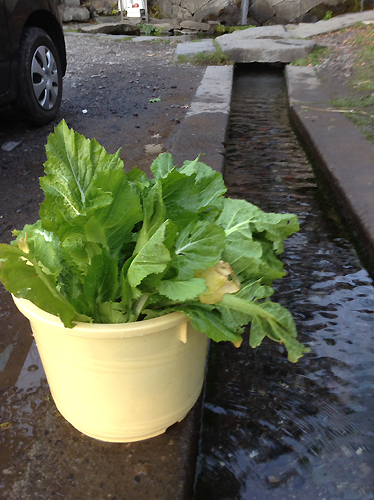 しゃがんで高菜を洗っていると、水汲みに着た方に「かっこ良い支度ですね」と声をかけられた。