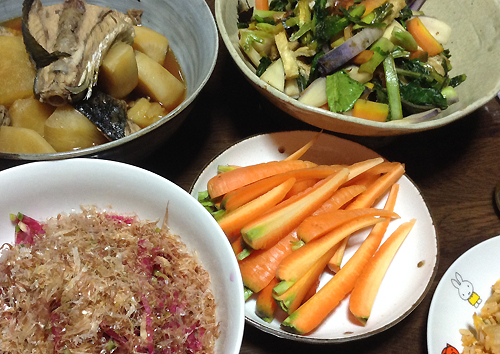 野沢菜と聖護院の葉っぱとニンジンの炒め物。菜種油でいろいろ節をじゅわっと炒め、ニンジンを入れてよーく炒め、葉っぱを入れてさらに炒め、野菜がしんなりしたところで油揚げを入れて、塩と醤油で味付け。