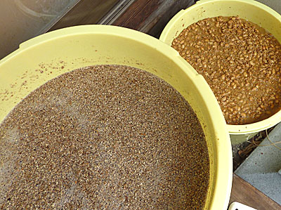 挽いた小麦と種麹を合わせ、大豆にまぶしていく。