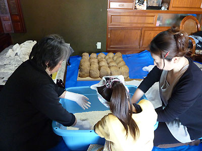 リョウコとチビスカが玉をお湯で軽く洗い、えみぃ&スカオットが潰してから麹とまぜるという連携プレー。