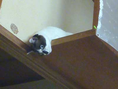 音二郎はと言うと、子猫たちが登れない高い場所を転々としながら平静を装ってるけど、ニアミスになるとびっくり仰天、逆毛をたてて逃げ回る毎日。