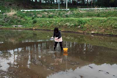 今年のテーマは「深水」。10センチぐらい水がたまるようにしたいと言うと、リョウコさんは畦塗りの補修を始めた。