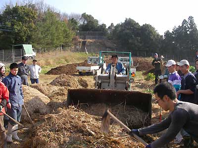 すでにお弟子さんが草を集めて粉砕してくださってあるし、他の材料(豚ぷん、もみがら、米糠)もそこにそろっているので、あとは積むだけ。