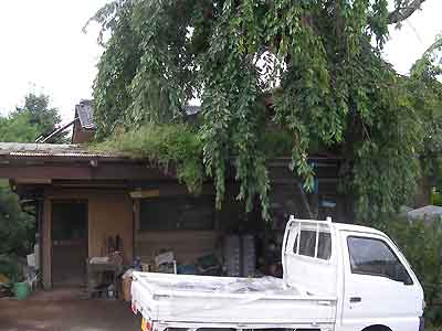 車庫の横に軽トラックを置いて、弟が屋根に上って土を下ろす。えみぃはトラックの荷台からひっぱる。