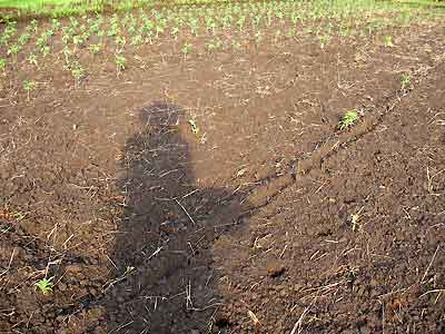 しゃがみこんで穴を掘ってまき始めたんだけど、「循環農法」には「足跡をつけてかかとのところに豆をまく」って書いてあったのを思い出した!