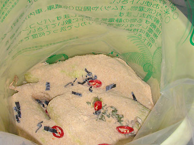 去年と同じ分量の、米ぬか、塩、砂糖をいいかげんにまぜ、自家製の韓国唐辛子、コブを細かく刻んで、漬け込み開始。