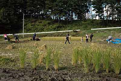 残されたものたちは、職人が刈った稲の束を1箇所に集めたり、落穂を拾ったり。