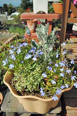 まずは、ブルーデイジーとシロタエギクと、もういっこ、なんだっけなー。名前が思い出せないけど、青い系統の寄せ植え。この青い花は、適度に刈り込むと秋までずっと咲いてくれて良いのだ。