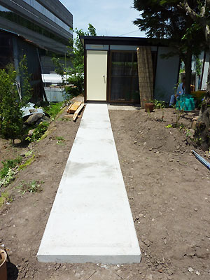 荒れ放題だった庭の奥に小屋が建ち、そこからまっすぐコンクリートのアプローチができました。