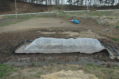 えみぃん家の田んぼは標高800メートルの寒冷地だから、そのやり方だと寒すぎるなぁってことで、ベットの上にトンネルを作って透明なマルチを張ることにした。