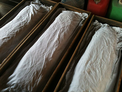 混ぜ終わったら木箱に積んで、袋をかぶせる。