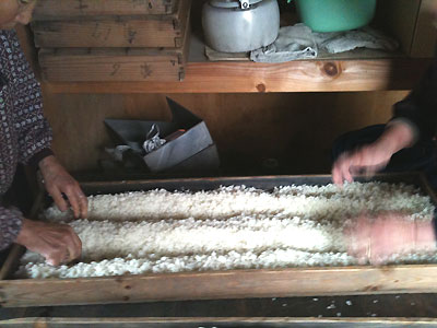 30日の朝7時から米を蒸し、蒸し上がったところから種麹をまぶしてよく混ぜる。