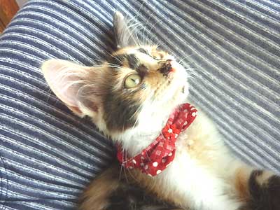 音&るんは「ちっさいうちはかわいそうだから、ある程度大きくなってから」なーんて思っていたら、いやがってつけられなくなってしまった。だので、子猫たちは早目にーと、音&るん用に買ってあった首輪を早速装着。