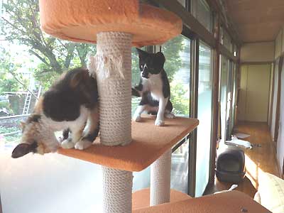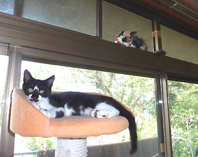 音二郎はと言うと、子猫たちが登れない高い場所を転々としながら平静を装ってるけど、ニアミスになるとびっくり仰天、逆毛をたてて逃げ回る毎日。