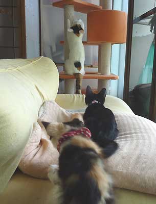 好奇心いっぱいで音&るんにからみたい子猫達に対し、発情中でお外のボーイに夢中のるんは完全無視。