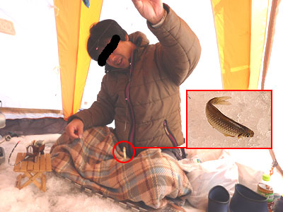 それじゃぁ移動するかってなったトタン、良いサイズのワカサギがシシド氏の竿にかかる。