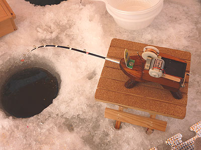 だけど置きっぱなしではだめで、ときどき揺らして魚を誘い、台の上に置いて待つというやり方。
