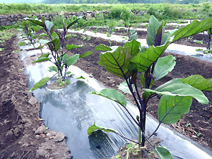 トマト、ナス、きゅうり、ピーマン、とうもろこしなど、2か所の畑をまわって確認。