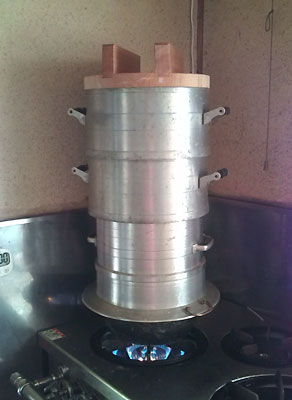 お釜に水をセットし、せいろを3つ重ねて、ツーバーナーをオン!