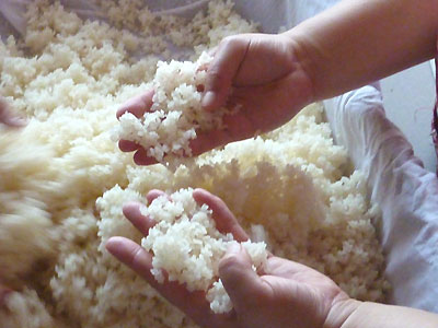 猫たちが入れない座敷にパイプ机を広げ、その上に濡らしたさらしを広げ、蒸し上がった米を広げる。