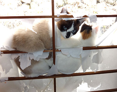 すでにビリビリに破かれた障子紙の間をくぐって、障子とサッシの間に。