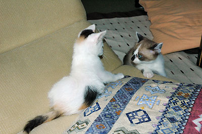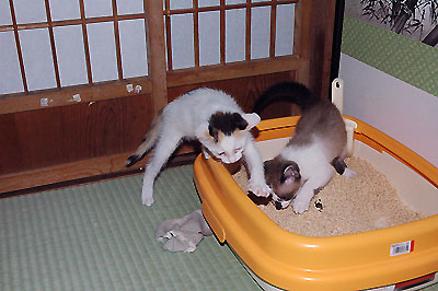 るんは、初めておとを見るなり猫パンチ!おとは最初びっくりしてぼーっとしていたけど、次第に応戦するようになり、あっちゅー間にバトルに突入。