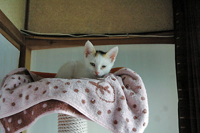 そして疲れると、るんはキャットタワーのてっぺんに避難してお昼寝。