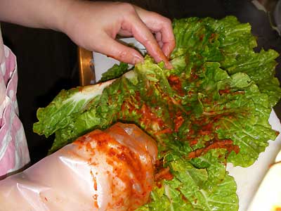 塩漬けの白菜でヤンニョムをまいて試食。
