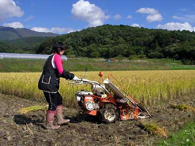 夜勤明けのリョウコが、バインダー(稲刈機)を持って参上すると、一気に作業モードに突入。