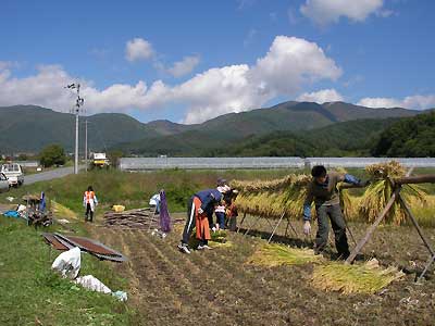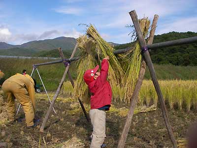 自分の身長よりも高いはぜに、稲の束をかけるJr.。ちゃんと7対3に分けてるし。すごいぞ。