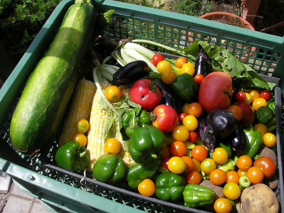 てなわけで、逝く夏を惜しむかのように夏野菜を収穫。ほんの30分ぐらいでこんな量になっちゃう。