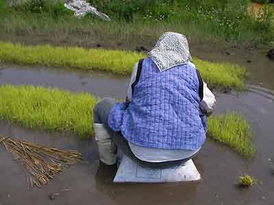 肥やし袋に籾殻(もみがら)をつめて縛った椅子に座って、苗を抜く。