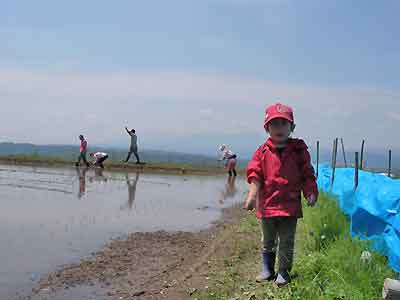 それから田んぼへ行って、リョウコと弟と3人でお田植え。