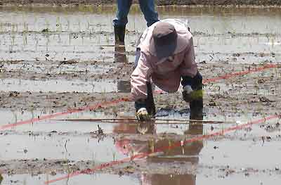 大人たちは、基準線を植える人と、間を植える人に分かれて作業開始。