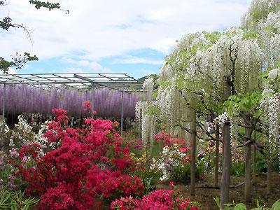広い園内のあちこちに、八重藤の棚や、白藤や黄色い藤のトンネルなんかがある。きれいにお手入れされた園内には、つつじやシャクナゲなんかも咲いてて、極楽のような美しさ。
