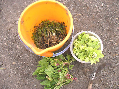と、お局様を小屋に戻し、フキノトウ、セリ、ほうれん草などを収穫。