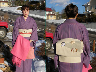 紫にエンジの縞が入った渋い着物なんだけど、うさぎちゃんがかわいい白い名古屋帯と、ピンクの帯揚げ&帯締めを合わせて若々しくコーディネイトしてみた。半襟もピンクでかわいいのだ。