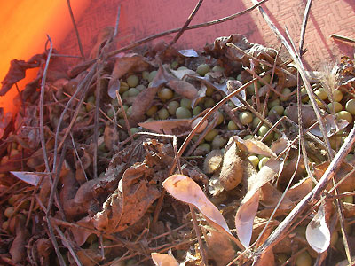 3人でもくもくと作業すること3時間。甘く見てたんだけど、あっちゅーまに時が過ぎちゃって、全部終らないうちに日が暮れ始めた。最後のほうはゴミの除去も適当になったけど、なんとか全部の豆をこなした。