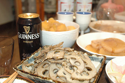 お料理は、なずなのレンコンで作った「キンピラ」と、なずなのごぼうを使った「たたきごぼう」と、自家製大根を使った「ダイコンのべっこう煮」と、「ダイコンの浅漬け」と、自家製ジャガイモを使った「肉じゃが」。