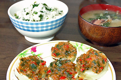 特性味噌っていうのは、ねぎの青いところと自家製韓国唐辛子をなたね油で炒めて、味噌とみりんを混ぜて作るものなんだけど、これがご飯にもお酒にも合って重宝してる。今回は大根ステーキにのせてみました。