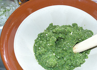 ある程度細かく擂れたら、荒めのザルで裏ごしして、通らなかったものをまた擂る。という気の遠くなりそうな作業を続け、ハラペーニョペーストを作る。