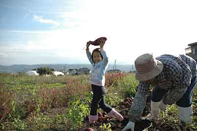 リョウコが「さつまいもがいい感じ」だと言うので、みんなでイモ掘り。