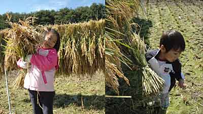 と感激のマナザシ。マシーンが刈った稲を、みんなで縛ると思っていたらしい。