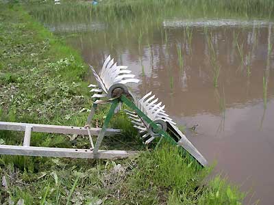幸いにも、ウチの田んぼにはヒエが出ていないけど、オモダカがびっしり出てきてたんで、8日、今にも泣き出しそうなお天気の中、いよいよ「コロガシ」の出番っ!