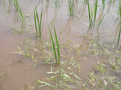 えみぃの適当な代掻きのせいで、田んぼの中は水が深いところと浅いところとマチマチなんだけど、浅いところのほうが草が大きい。深水って、効くねー。