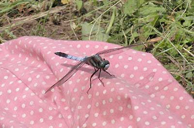 パラソルの下に腰掛けておにぎりを食べていると、えみぃが脱ぎ捨てたテッコの上に、シオカラトンボが止まった。