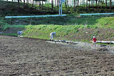 先週、まりぞうさんにポチで耕してもらったんで、穴掘りは比較的らくちん。水を流し込んで、水路をどんどん延ばしていく。この作業は、昔やった砂遊びみたいで、なんだか楽しい。