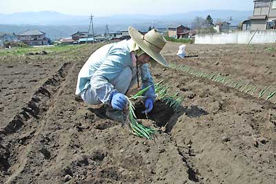 じゃがいもが終わると、休む間もなくねぎ苗を植える。