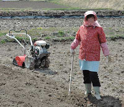 だけど、じゃがいもを植える場所が、まだ全部耕せてないのだ。20年ものの耕運機(以下お局マシンと呼ぶ)の調子が悪かったから、がんばらないと日が暮れちゃうぞーと、気合十分で畑に着くと、すでに、リョウコが半分以上終わらせてた。さすがリョウコさん。