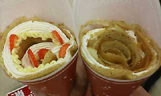 見た目はクレープみたいだけど、生地の作り方や焼き方、クリームの塗り方や巻き方が独特で、クレープとは似て非なりという代物。
